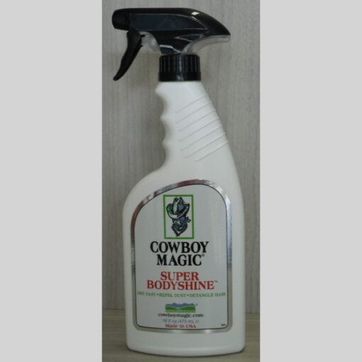 - Il aide à repousser la poussière: Super Bodyshine® rend plus difficile l’accumulation de poussière sur les cheveux dans les ring d’exposition et les stalles, ce qui permet d’économiser du temps et du travail de toilettage.